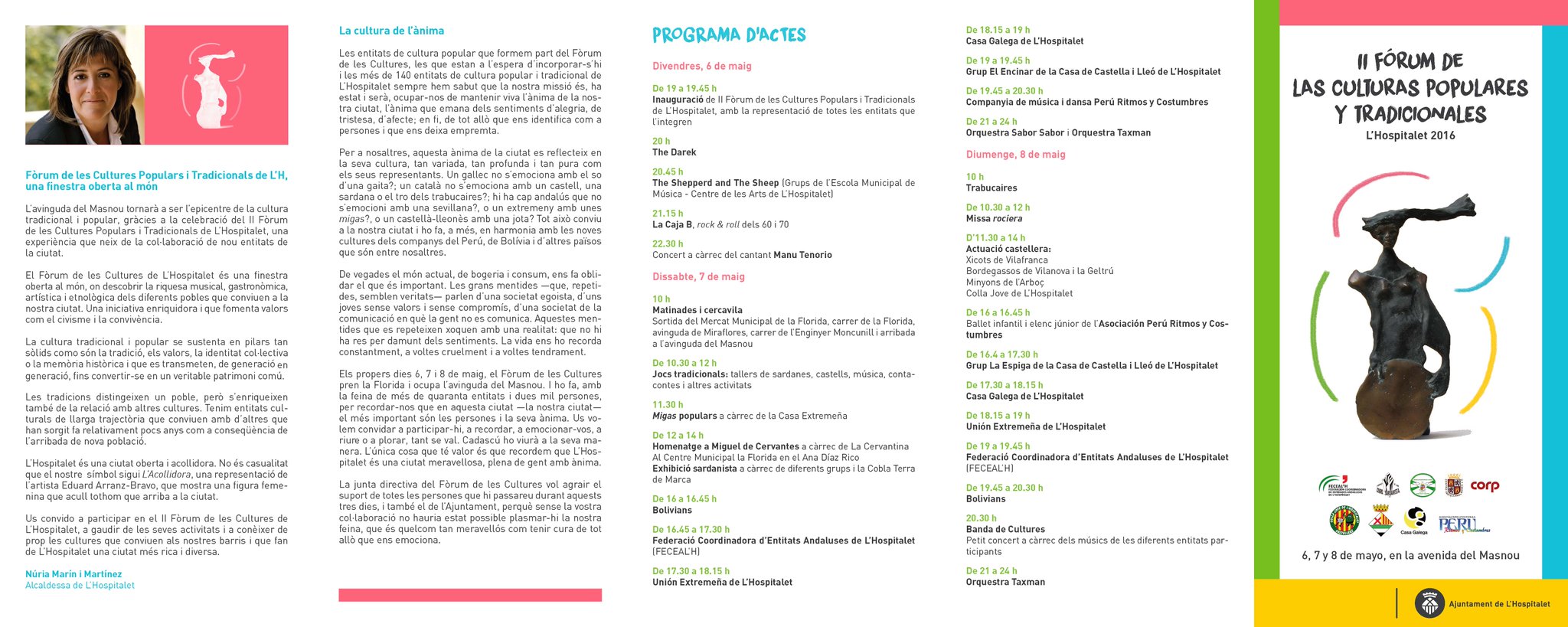 La segunda edición del Fórum de las Culturas Populares y Tradicionales de la Ciudad de L’Hospitalet, que se celebrará entre el 6 y el 8 de mayo en la avenida Masnou, acogerá dos nuevas culturas: la peruana, representada por la Asociación Cultural Perú Ritmos y Costumbres; y la boliviana, de la mano de Espíritu de Santa Cruz de la Sierra y la Asociación Centro Cultural y Folclórico Virgen del Socavón.